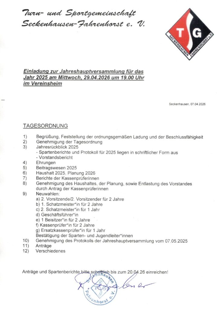 Am 29.04.26, ab 19:00 im Vereinsheim, findet die diesjährige Jahreshauptversammlung der TSG-Seckenhausen Fahrenhorst statt.